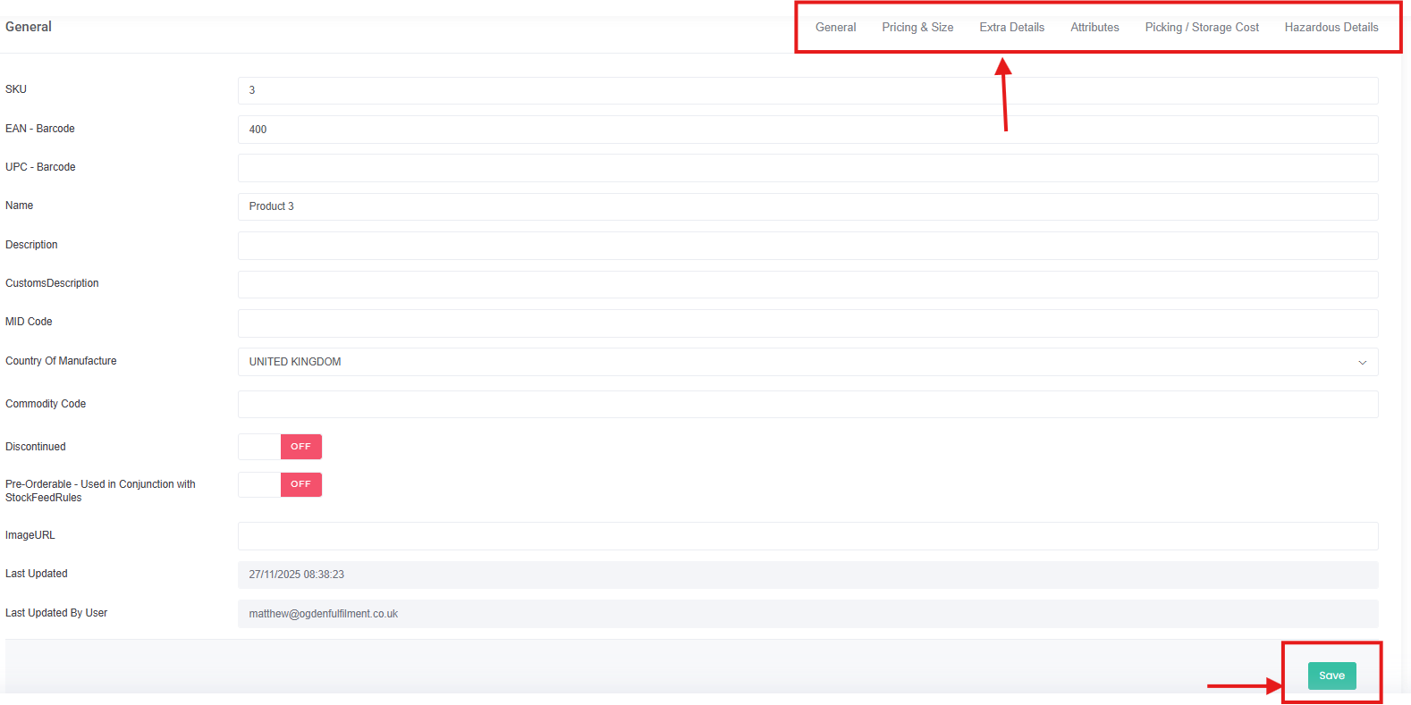 3. Make any changes in the General, Pricing & Size, Extra Details, Attributes, Picking/Storage Cost and Hazardous Details tabs:
