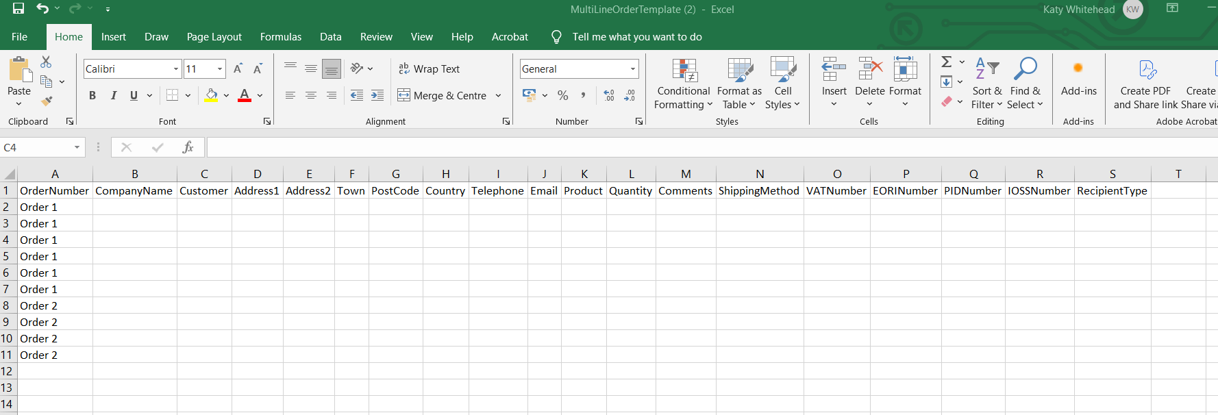 1. Enter the order details in the spreadsheet, as you can see from the example use each line for each item, so if the first order has 6 items, you will need 6 lines for that order. You then continue with the second order immediately below. Once completed, save the spreadsheet ready to upload.