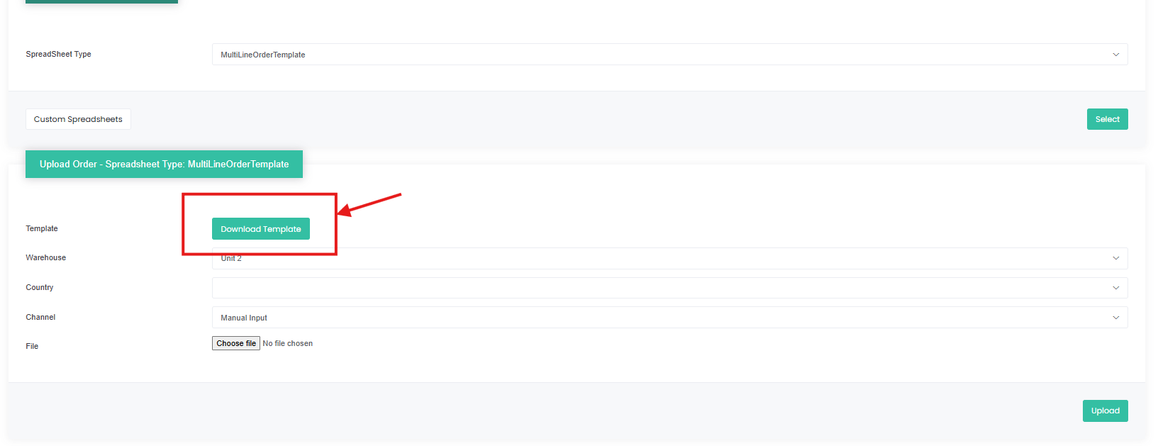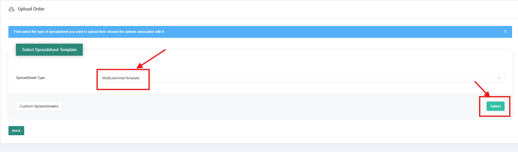 2. From the upload order page, select MuliLineOrderTemplate or SingleOrderPerLine from the spreadsheet type and press select: